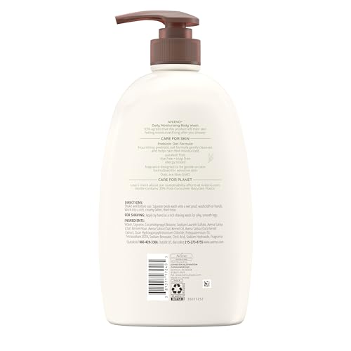 Aveeno Daily Moisturizing Body Wash for dry skin is a gentle, lightly scented shower gel and body wash for both women and men, formulated with nourishing prebiotic oat to gently cleanse and helps skin feel moisturized. This body wash for dry skin and sensitive skin creates a lather that cleanses, leaves skin feeling soft, smooth, and moisturized long after you shower. Allergy-tested, paraben-free, dye-free, and soap-free formula, is ideal for those seeking a sensitive skin body wash. Packaged in a 33 FL OZ bottle, this dual-purpose formula also works as a shave gel for silky, smooth legs, offering added value and versatility for your daily routine. To use, dispense onto a wet washcloth or hands, work into a rich lather, and rinse thoroughly. Ideal for those seeking a body wash for men, a body wash for women, or a shower gel that cleanses and helps skin feel moisturized. Complete your routine by following with Aveeno Daily Moisturizing Body Lotion to help lock in moisture for 24 hours. Aveeno a dermatologist recommended brand for over 70 years, this body wash is suitable for those who want a body wash, a sensitive skin body wash, or a moisturizing body wash for dry skin, and an all-in-one multi-benefit formula.