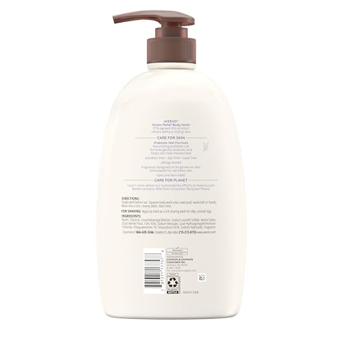 Aveeno Stress Relief Body Wash is a nourishing body wash for women & men. Formulated with prebiotic oat & a calming lavender scent to help you feel calm & relaxed during your daily shower or bath. This paraben-free, dye-free, & soap-free body wash gently cleanses while removing dirt, oil, & impurities, leaving skin feeling moisturized & nourished. Designed for daily use as part of your skin care routine, this allergy tested body wash is ideal for those seeking a gentle cleanse while feeling calm & relaxed in the shower. This lavender scented formula provides a calming & relaxing shower experience while gently cleansing. This body wash lathers quickly & leaves skin feeling moisturized without drying out skin. To use, shake well, apply to wet hands or a washcloth, work into a rich lather, & rinse thoroughly. For best results, follow with Aveeno Stress Relief Lotion to help maintain skin’s natural moisture barrier. This body wash is a great addition to your daily skin care regimen, offering gentle cleansing & for all skin types, especially those with sensitive or dry skin. Experience the difference of a body wash that not only cleanses but also helps you unwind, making every shower a calming escape. You can enjoy the benefits of a dermatologist recommended brand, a body wash that supports healthier-looking skin & comfort every day.