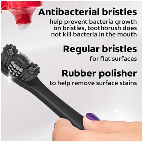 Features soft charcoal toothbrush bristles and a rubber polisher to help remove more surface stains* (*vs. an ordinary flat trim manual toothbrush)