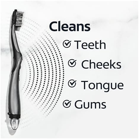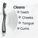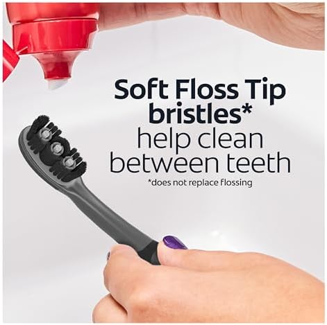Black toothbrush with charcoal infused bristles features soft Floss Tip bristles* that help clean between teeth (*does not replace flossing)