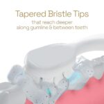 The battery toothbrush features soft tapered Floss-Tip (1) bristles that reach deeper (2) along the gumline and between teeth to remove bacteria
