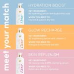 Doves Skin Replenish Body Wash instantly gives moisturized looking skin.This creamy body wash transforms into velvety foam, filling your shower with notes of dewy freshness & soft florals. Has your skin been missing out? New Dove Serum Shower Collection is infused with active skin care ingredients to supercharge your body care routine. Quench thirsty skin with hydrating serum + hyaluronic acid, help prevent acne with acne clearing salicylic acid treatment, or recharge skin’s glow with brightening serum + vitamin C. Dove teamed up with leading dermatologists and beauty experts to create a new shower collection that brings expert skin care into your shower. Infused with the ingredients you already love using on your face (hello, hyaluronic acid!), these body washes, scrubs and beauty bars care were created for your unique needs. Because we think beautiful, visibly healthy skin is a head-to-toe kind of thing. Dove is the Dermatologist recommended body wash brand. This cleanser is made with naturally-derived gentle skin cleansers, no sulfates or parabens and is PETA-certified vegan.