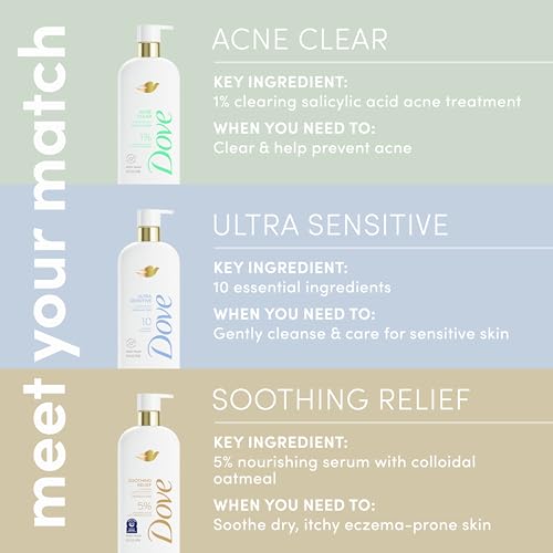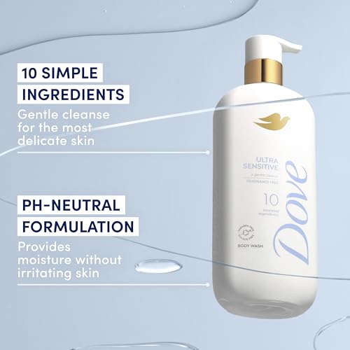 Dove Ultra Sensitive Body Wash is carefully formulated with only 10 essential ingredients and is fragrance free to gently cleanse even the most sensitive skin. This gel body wash transforms into bubbly lather to gently cleanse and care for sensitive skin. Has your skin been missing out? New Dove Serum Shower Collection is infused with active skin care ingredients to supercharge your body care routine. Quench thirsty skin with hydrating serum + hyaluronic acid, help prevent acne with acne clearing salicylic acid treatment, or recharge skin’s glow with brightening serum + vitamin C. Dove teamed up with leading dermatologists and beauty experts to create a new shower collection that brings expert skin care into your shower. Infused with the ingredients you already love using on your face (hello, hyaluronic acid!), these body washes, scrubs and beauty bars care were created for your unique needs. Because we think beautiful, visibly healthy skin is a head-to-toe kind of thing. Dove is the Dermatologist recommended body wash brand. This cleanser is made with naturally-derived gentle skin cleansers, no sulfates or parabens and is PETA-certified vegan.