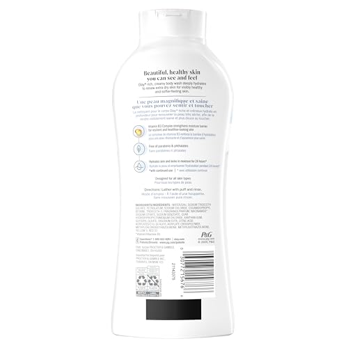 Hydrate, rejuvenate, and give your skin the nourishment it needs in one incredible body wash. Designed for all skin types, Ultra Moisture Hydrating Body Wash hydrates skin and locks in moisture for 24 hours.* Get the visibly healthy skin that you want in 14 days. Give your routine a boost with this rich, creamy, moisturizing body wash that renews extra dry skin. Olay’s Vitamin B3 complex creates a moisture barrier for resilient, healthy-looking skin. It is free of parabens and phthalates. Directions: Simply lather with a puff and rinse. At Olay, we’re serious about our commitments. Our Olay Skin Promise to you is zero skin retouching in all advertising. Olay is the first mass skin care brand in the U.S. to take this stance because we know real beauty is honestly beautiful. We also guarantee you’ll love your Olay product. If you are not satisfied, we’ll give you your money back via a prepaid card. Must submit within 60 days of purchase. Call toll-free 1-855-845-9797 or visit olay.com/guarantee. *With continued use
